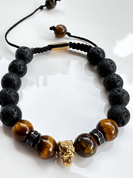 Lava Stone Mix and Tiger Eye Bracelet with Gold Tiger Charm