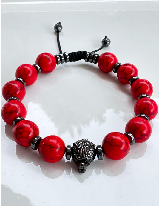 Red Turquoise and Hematite Bracelet with Wolf Charm