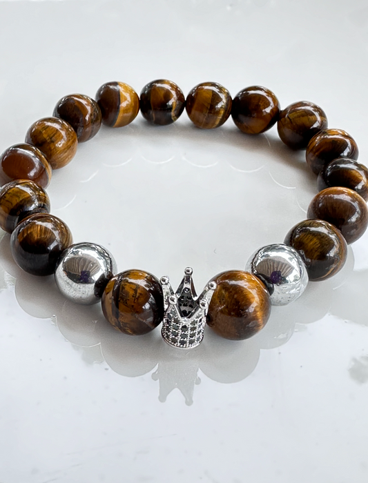 Tiger's Eye and Silver Hematite Bracelet with Crown Charm