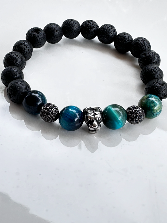 Lava Stone and Green Tiger Eye Bracelet with Tiger Charm