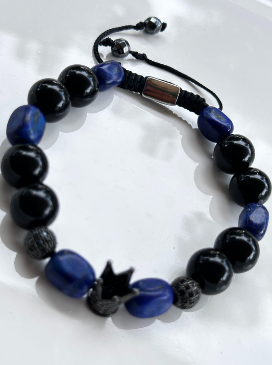 Black Onyx and Blue Lapis Lazuli Stone Bracelet with Crown Charm