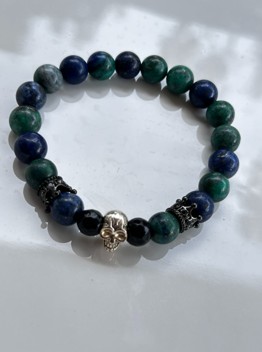 Lapis Lazuli Stone and Black Onyx Bracelet with Skull and Crown Charms